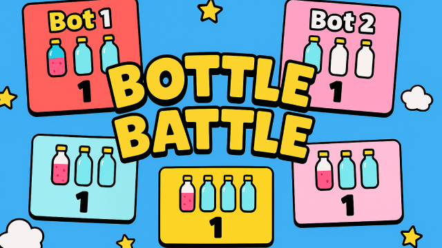 Bottle Battle is a turn-based strategy game where each player starts with five soda bottles. On your turn, you send fizz from one of your bottles to an opponent’s — if any bottle reaches 5 fizz, it explodes! You can also “rewire” fizz between your own bottles. Last player with any bottles left wins!